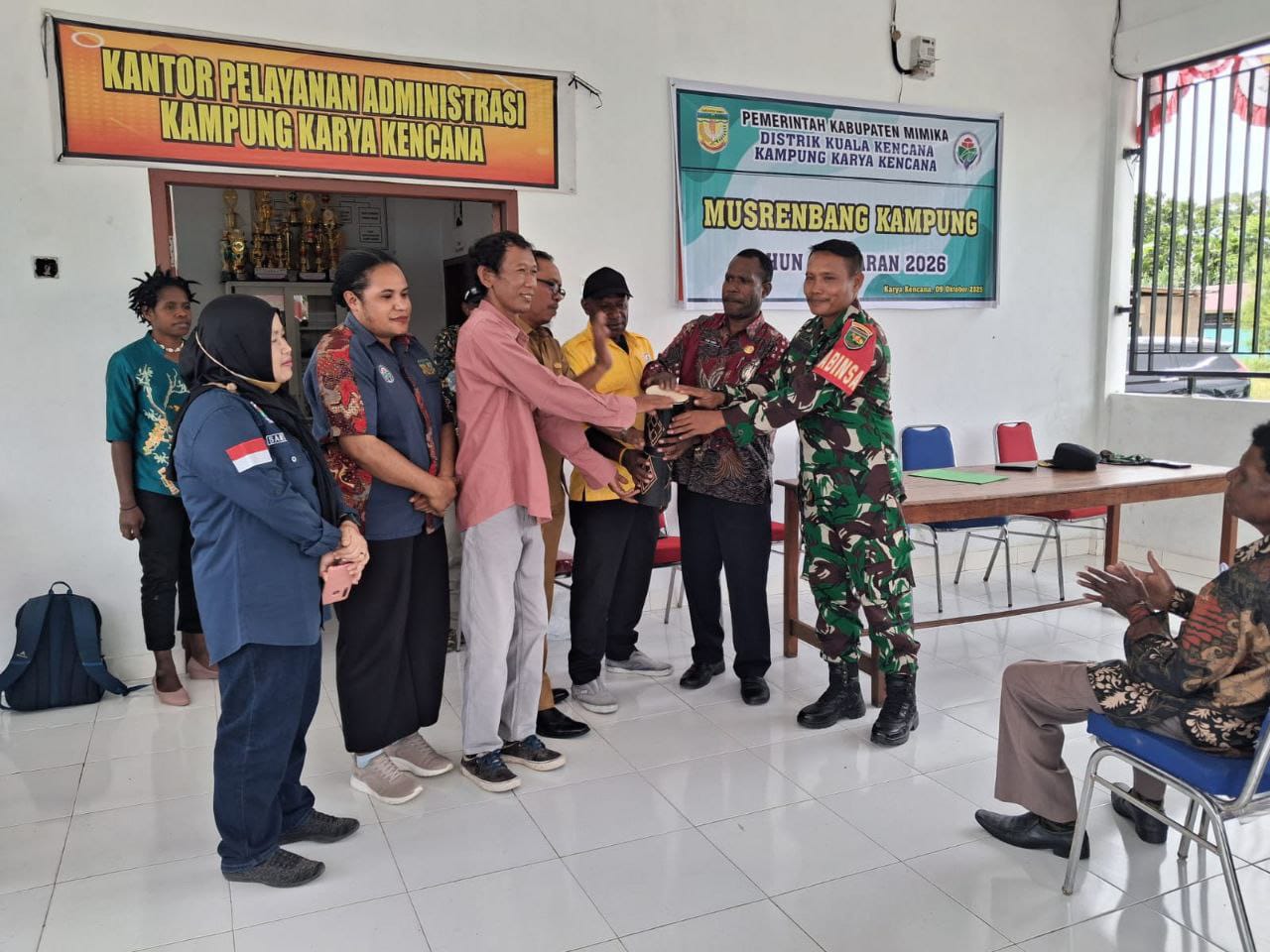 Timika – Musyawarah Perencanaan Pembangunan (Musrenbang) Tingkat Kampung adalah forum musyawarah tahunan para pemangku kepentingan ditingkat kampung untuk menyepakati Rencana Kerja Pembangunan Kampung (RKP). Sebagai bentuk dukungan setiap program pembangunan di wilayah binaan, Babinsa Koramil 1710-03/Kuala Kencana Pelda Butar Butar menghadiri kegiatan Musrenbang Tingkat Kampung TA 2026 bertempat di Balai Kampung Karya Kencana, Distrik Kuala Kencana, Kab. Mimika yang dipimpin oleh Kadistrik Kuala Kencana, Bapak Yemi Gobay, Kamis (09/10/2025).
