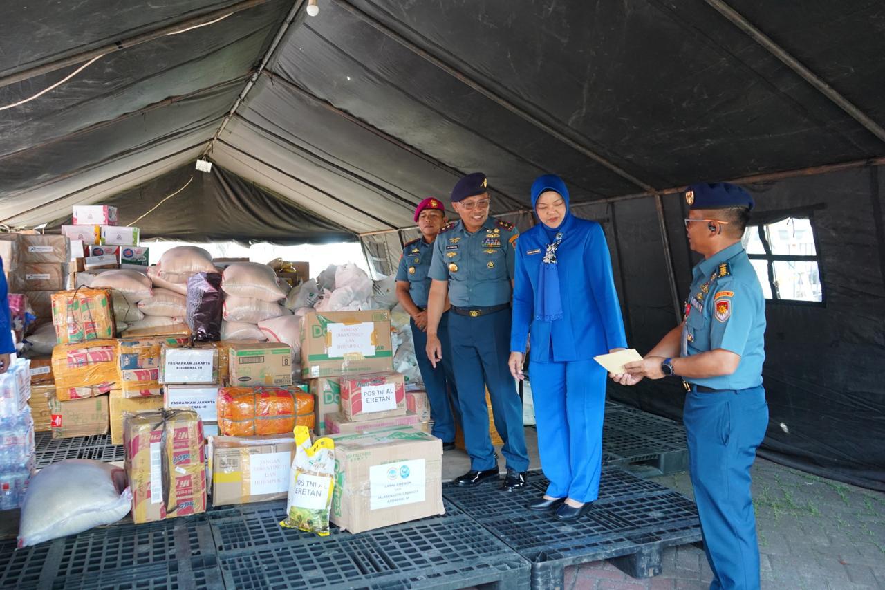 Komandan Kodaeral III, Laksda TNI Uki Prasetia, S.T., M.M. yang didampingi Ketua Daerah Kodaeral III Gabungan Jalasenastri Koarmada RI, Ny. Hening Uki Prasetia meninjau posko penerimaan bantuan kemanusiaan yang berada di Makodaeral III, Jakarta Utara, Senin (1/12).